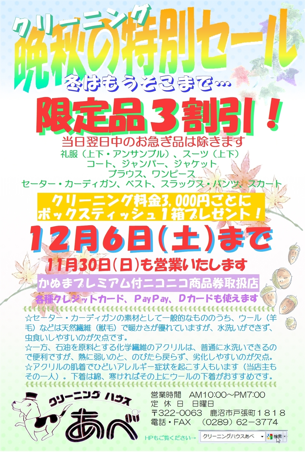 ただいま、洋服のクリーニング限定品3割引セールを開催しております。冬物、夏物、礼服から普段の洋服まで各種お持ちください。特殊素材の品、大切な品物にお勧めしたい「デラックス1点洗いコース」もあります。ぜひお試しください。